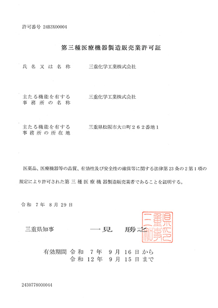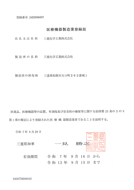 三重化学工業株式会社は、医療機器製造販売業、医療機器製造製造業の許可を取得しております。